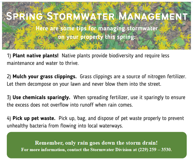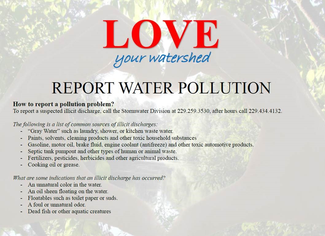 Remember: only rain goes down the storm drain! For more information, contact the Stormwater Division at (229) 259–3530.