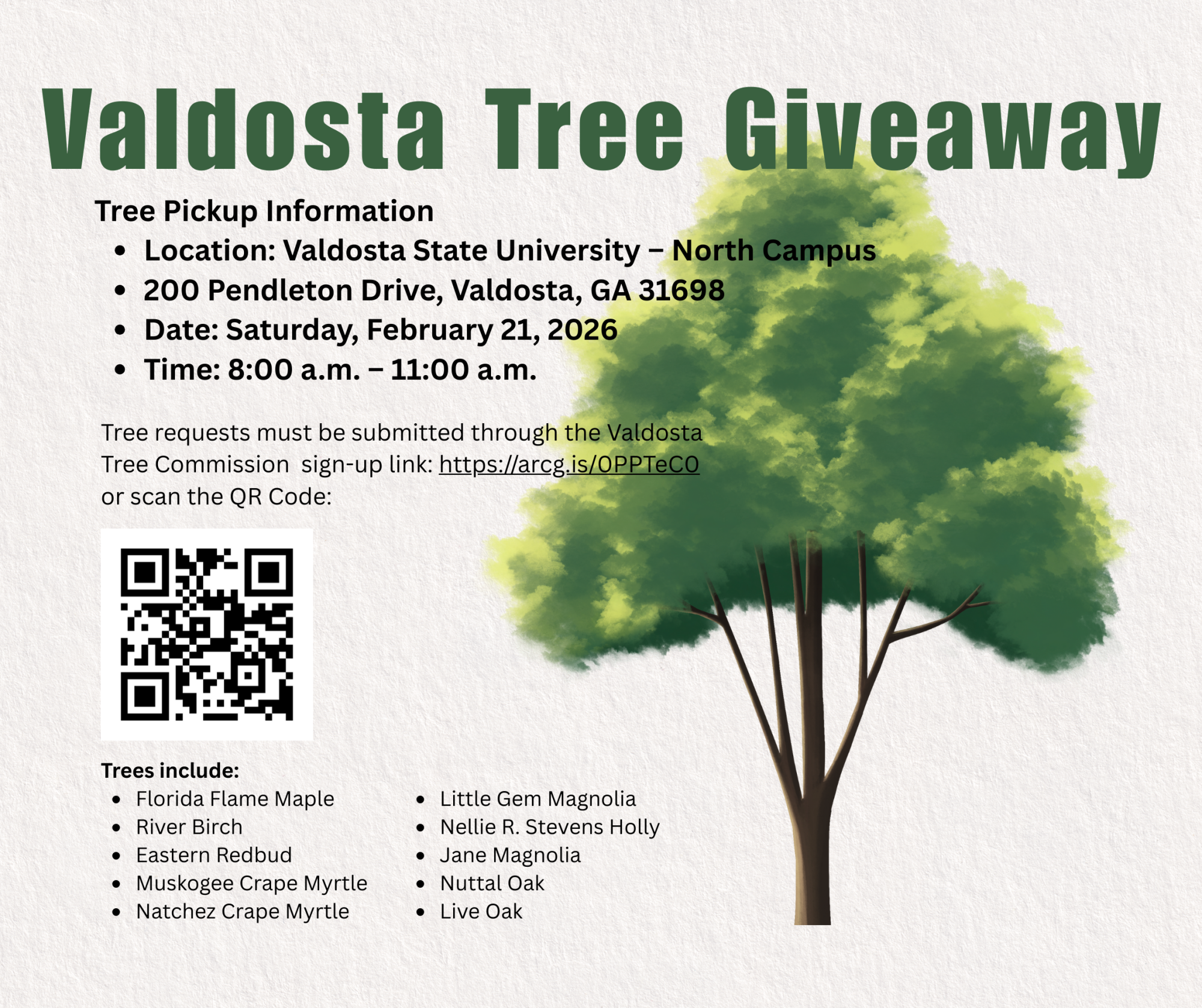 Tree requests must be submitted by February 9, 2026, through the Valdosta Tree Commission sign-up link at https://arcg.is/0PPTeC0 or by scanning the QR code provided on promotional materials. Requests are subject to availability.